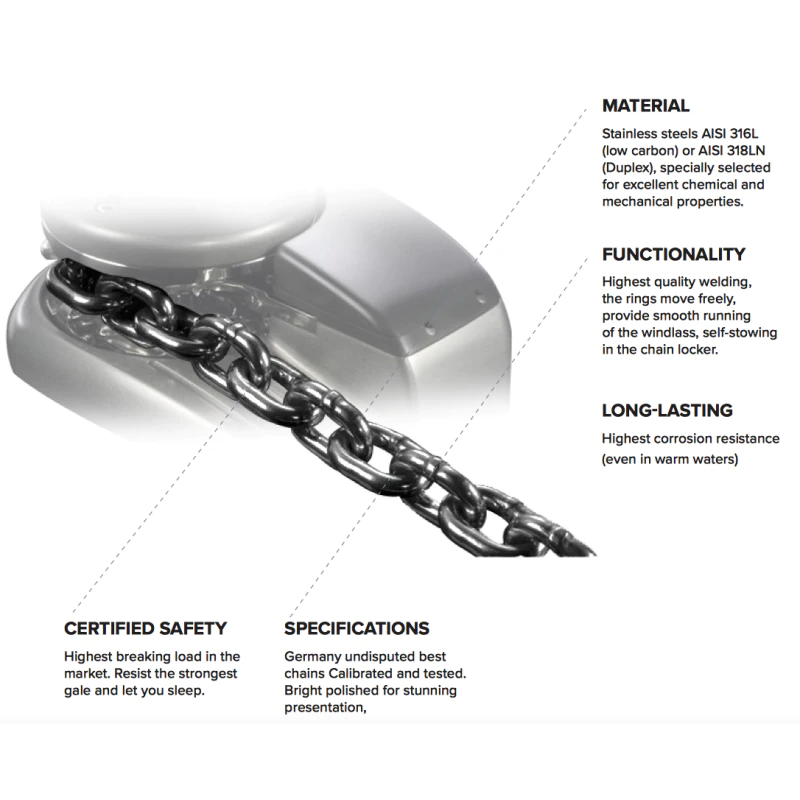 Besides Ultra Marina products we offer also stainless steel chain made in Germany from best quality stainless steel. Sizes are from 6 mm up to 13 mm and in ISO or DIN norm. You can also chose from stainless steel quality Grade 60 (AISI 316 L), Grade 60 PLUS (AISI 318 LN Duplex) and Grade 60 PLUS (Superduplex A182 F61). All chains are tested, calibrated and bright polished. Stainless steel chains help match our Ultra Anchors and Swivels the best way and having stainless steel chain helps you to store your chain in your locker and there is no need of re-galvanization in the future..